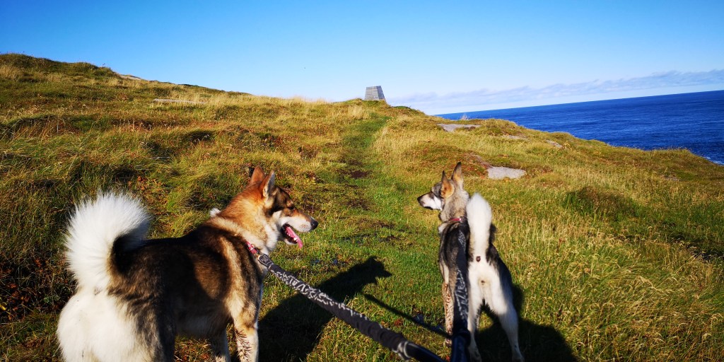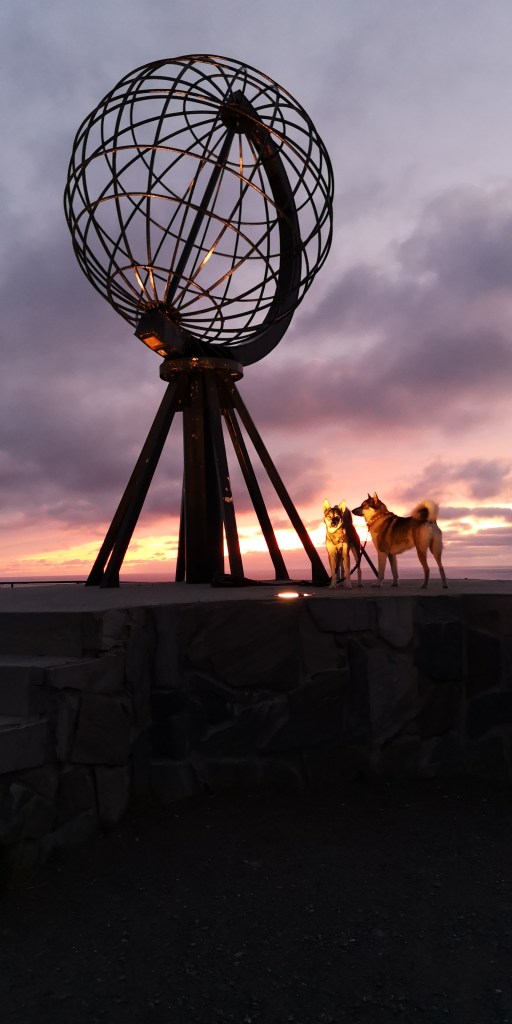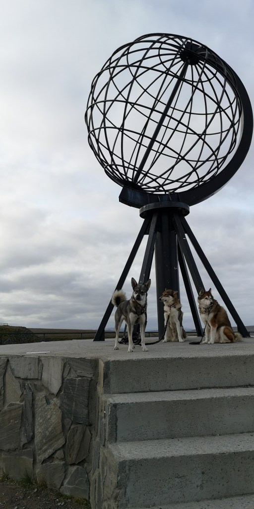 De volgende ochtend rijden we de laatste zeven kilometer vanaf Knivskjelodden Trail Parking naar de Nordkapp. De enorme parkeerplaats is vrijwel leeg op een twintigtal campers en één tentje na. De Nordkapp bestaat uit een plateau van zo’n 307 meter, dat hoog boven de Noordelijke IJszee uittorent. We staan nu op slechts 2080 kilometer van de Noordpool af. Er staat een soort groot stenen fort, dat de Nordkapphallen heet. De achterkant bestaat uit een glazen wand, en erbovenop staat een wereldbol. Het kost ruim driehonderd kronen om er binnen te komen. Ik vind het teveel geld, maar met dit ticket heb je toegang tot een panoramafilm, historische tentoonstelling, een souvenirswinkel en restaurant. Ik loop met de honden naar de wereldbol aan de achterzijde van de hallen, en ik laat ze poseren voor een paar foto’s.