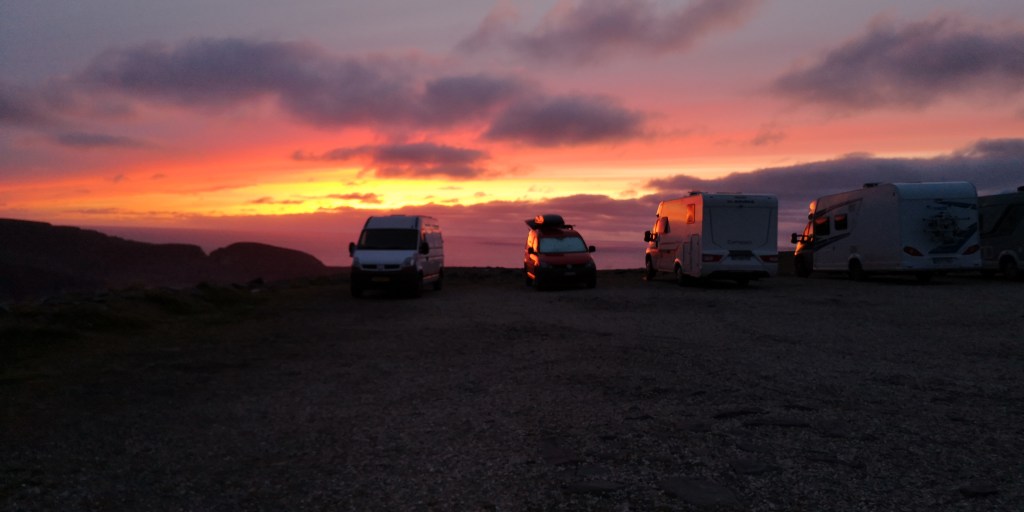 Vanaf dit punt kijken we neer op de landtong Knivskjelodden, waar we gisteren liepen. De rotsen lijken vanaf hier helemaal niet zo schuin af te lopen. We banjeren er een beetje rond. Na de pittige wandeling van gisteren wil ik het even rustig aandoen vandaag. Vanuit onze bus op het uiterste linkerhoekje van de parkeerplaats zien we het verkeer op gang komen. Er rijden bussen met Artic Tours erop, af en aan. Mensen snellen naar buiten om met een selfiestick foto’s te maken. Daarna gaan ze snel naar binnen in de warmte van de hallen. Tegen de avond blijven er zo’n tien campers over. Hoewel er helaas geen noorderlicht te bewonderen valt, genieten we toch van een mooie zonsondergang. De oranje gloed verlicht de zijkant van de campers. Het is vijf graden boven het vriespunt. Ik maak nog een beker warme chocolademelk voor mezelf, maar het opwarmen van het water kost mijn gaskookstelletje op butaan moeite met deze temperaturen. De vlam is minder sterk en het kost meer tijd om het water te laten koken. Achterin de bus heb ik nog een paar extra gasflesjes op propaan liggen. Propaangas kan beter tegen de kou, maar het voordeel van butaangas is weer dat het een hogere verbrandingswaarde heeft. Ik sta te huppen van het ene been naar het andere om een beetje warm te blijven, terwijl het water langzaam begint te koken. Daarna zet ik het water voor mijn kruik op, maar niet voordat ik het gasflesje heb geschud. Dat helpt soms een beetje om een betere vlam te krijgen. Ik ga met deze kou wel sneller door mijn gasflesjes heen. Ik verbruik nu ongeveer twee flesjes per week, terwijl ik tijdens onze reis door Ierland en Schotland ruim anderhalve week met één flesje deed. Ik maak er nu veelvuldig gebruik van voor het zetten van extra koppen warme thee en chocolademelk, warme pap in de ochtenden en het opwarmen van anderhalve liter water voor mijn kruik in de avonden. Om acht uur klim ik al naast de honden in bed. Ik heb lang ondergoed van merino wol aan, met daaroverheen een dikke fleece trui. Verder heb ik wollen sokken aan, een buff en een muts op. Ik heb dubbele gordijnen, die ik zowel achter als bij de voorstoelen dicht trek. Er ligt een snoeihete kruik tegen mijn rug, en ik slaap onder een dubbele winterdekbed. Mika ligt tegen mijn benen aan, en Moran kruipt bij mij onder het dekbed. Een heerlijke warmte verspreidt zich door mijn lichaam. Vanuit bed zie ik nog net een puntje van het oor van Marte. Ze ligt diep weggedoken in haar zachte mand. Ik laat een waxinelichtje branden in het kleine hanglampje boven het aanreachtblokje. Het schommelt zachtjes op en neer, terwijl buiten de wind blaast.